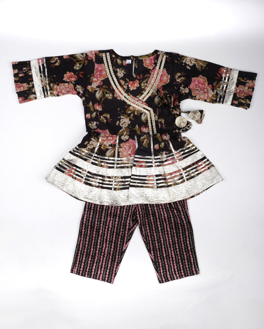 Midnight Florals Angrakha style pure cotton suit with Duppata